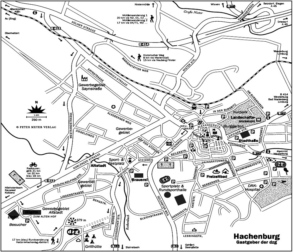 Anfahrt Mit öffentlichen Verkehrsmitteln: Von Frankfurt aus fahren stündlich direkte Regionalzüge (in Niedernhausen auch Anschluß von Wiesbaden) nach Limburg an der Lahn. Von 6 bis 20 Uhr winden sich von dort werktags fünfzehn, samstags und sonntags acht Züge durch den malerischen Westerwald über Westerburg (eventuell umsteigen) nach Hachenburg. Von Köln gelangt man in einer Stunde, von Siegen in 50 Minuten auf der Siegtalstrecke nach Au an der Sieg. Von dort verkehren etwa stündlich zwischen 6 und 21 Uhr Züge über Altenkirchen (evtl. umsteigen) nach Hachenburg. Busse fahren nach Hachenburg von verschiedenen Orten aus der Region. Freitags ist es auch möglich über die ICE Strecke Frankfurt-Köln (jeweils ca. 30 Minuten) zum Bahnhof Montabaur anzureisen, von dort dann den Bus nach Hachenburg direkt zu nehmen, Ausstieg Haltestelle Hachenburg Altstadt, nur wenige Minuten vom Platz entfernt.Mit dem PKW: Zum Alten Hof 57627 Hachenburg , DE E 7° 48.54672´ N 50° 38.93130´ Misstraue dem Navi! Zufahrt für Fahrzeuge nur über Koblenzer Str. – Lindenstr. – Zum Alten HofE 7° 48.54672´ N 50° 38.93130´Verpflegung: